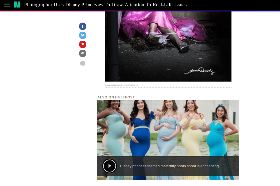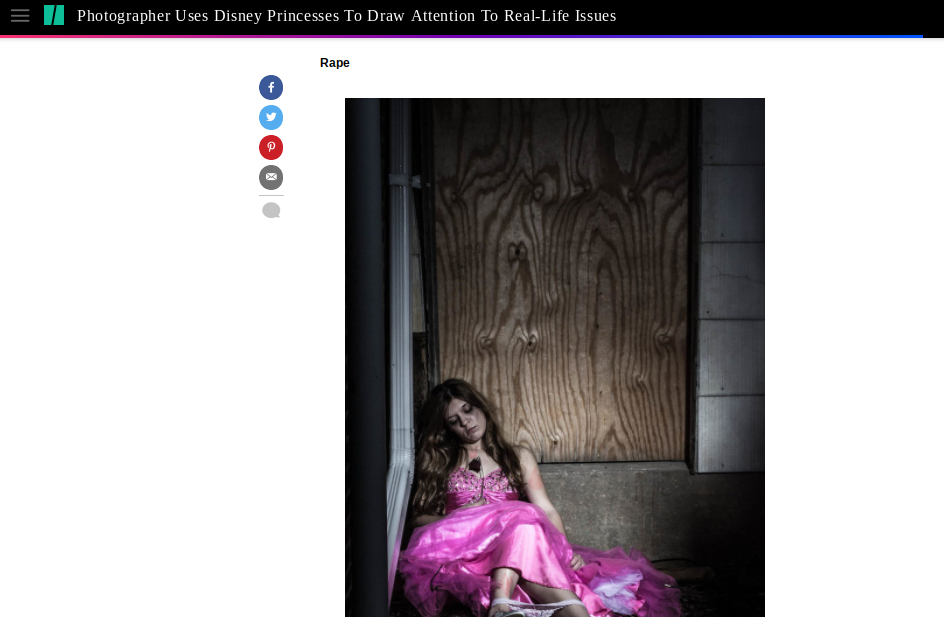 A friend shared this Huff Post article about a photographer using Disney princesses to highlight some of humanity’s ills. What the article fails to do is think about the automatic “related story” link that comes after: